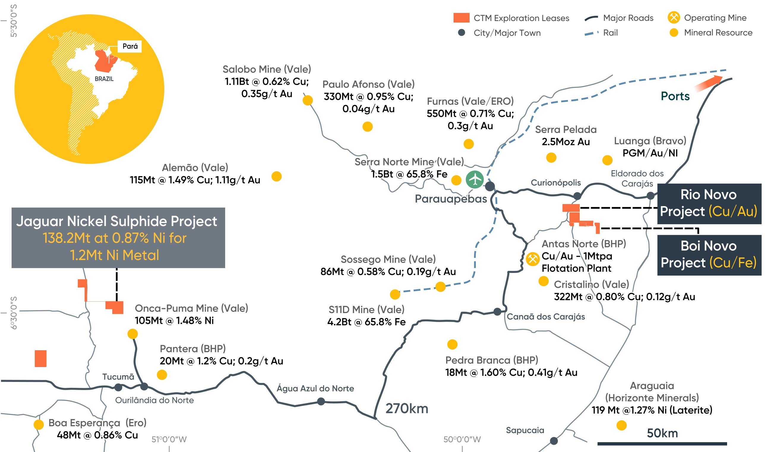 The project lies 30km from Parauapebas (population 250k), the regional centre of the Carajás Mineral Provence and the main base for personnel and service providers supporting Vale’s iron ore and base metal mines in the region, only 35km from Vale’s copper-gold concentrate load-out facility for the Salobo and Sossego mines, and less than 20km from BHP’s Antas Norte copper flotation plant.